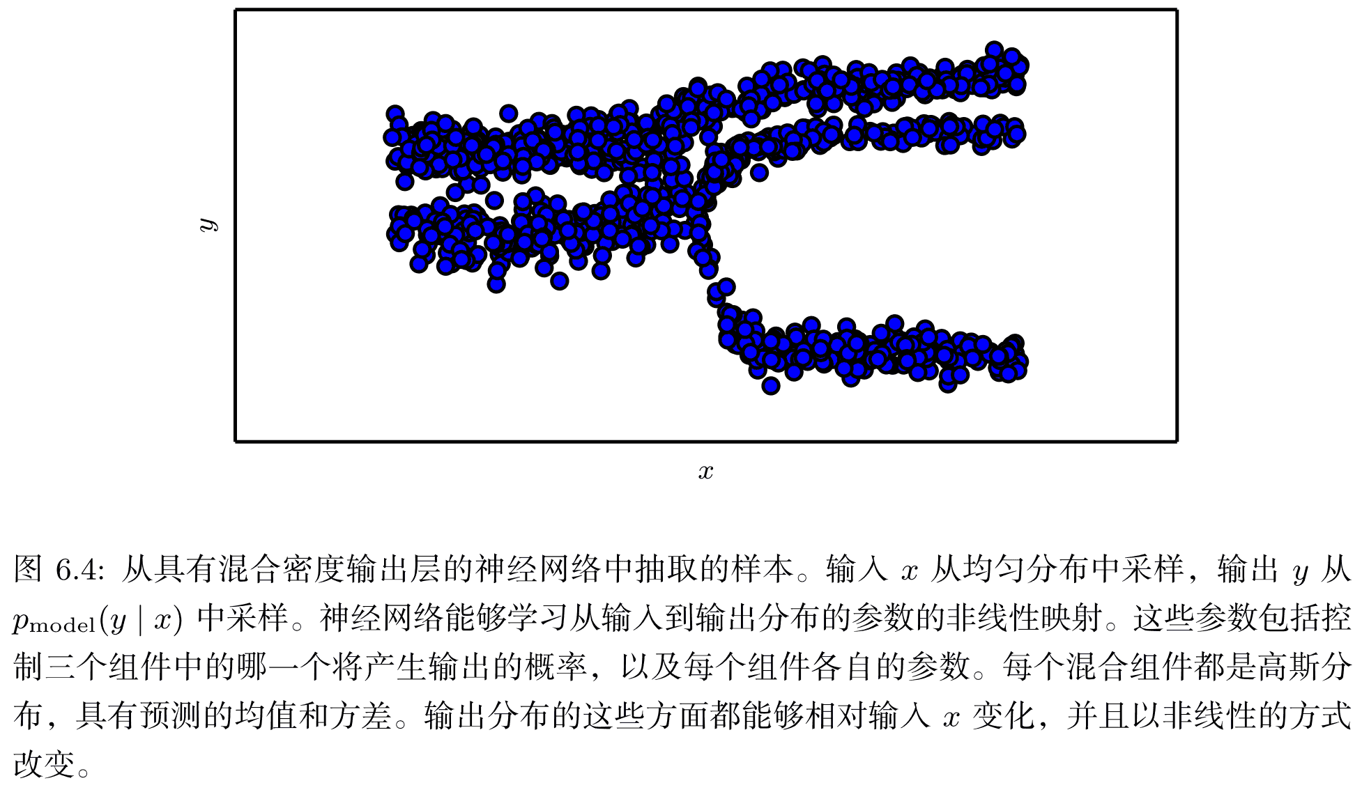 我们经常想要执行多峰回归,即预测条件分布\(p(\mathbf y\vert\mathbf x)\)的实值,该条件分布对于相同的\(\mathbf x\)值在\(\mathbf y\)空间中有多个不同的峰值。在这种情况下,高斯混合是输出的自然表示。将高斯混合作为其输出的神经网络通常被称为\(混合密度网络\)。具有\(n\)个分量的高斯混合输出由下面的条件分布定义: