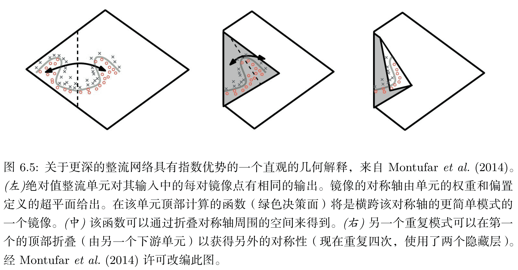 下图解释了带有绝对值整流的网络时如何创建函数的镜像图像的,这些函数再某些隐藏单元的顶部计算,作用于隐藏单元的输入。每个隐藏单元指定在哪里折叠输入空间,来创造镜像相应(在绝对值非线性的两侧)。通过组合这些折叠操作,我们获得指数级的分段线性区域,他们可以概括所有种类的规则模式(例如,重复)。