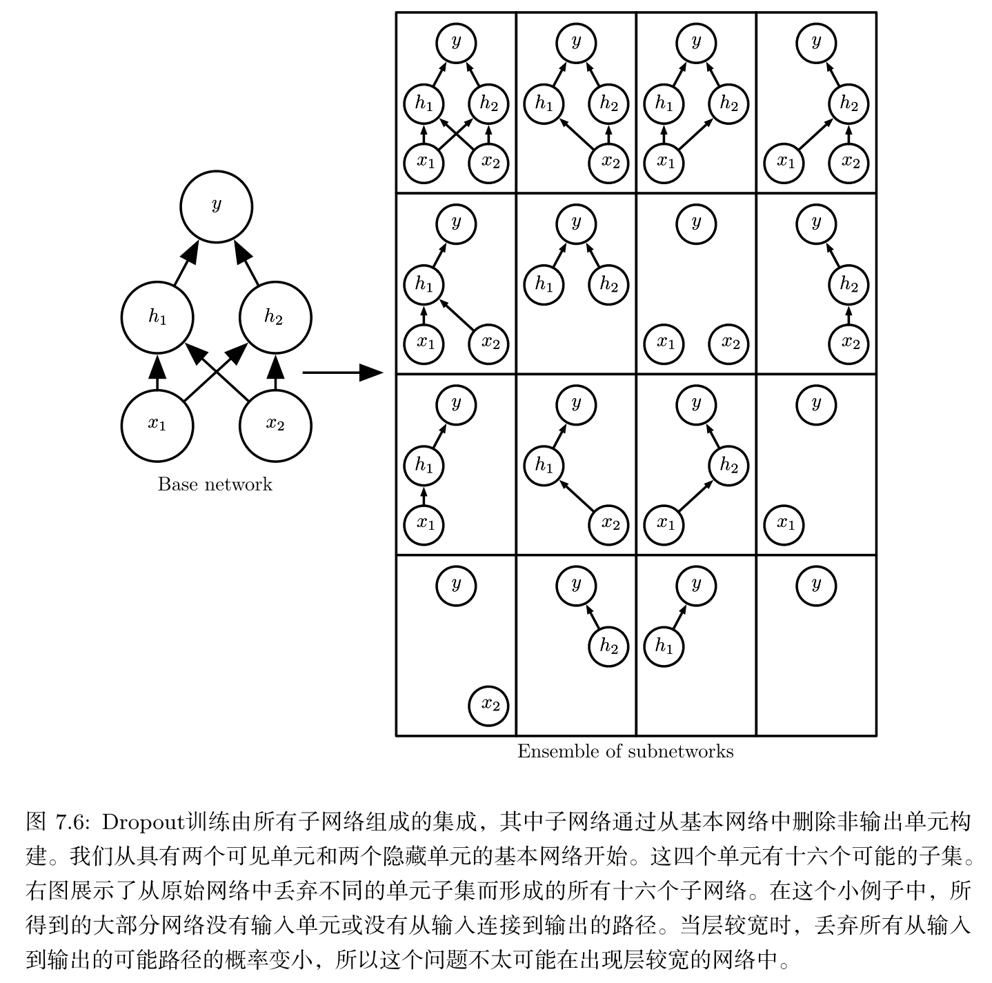 具体而言,Dropout训练的集成包括所有从基础网络除去非输出单元后形成的子网络,如图7.6所示。